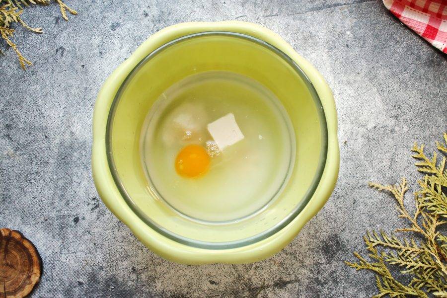 В миску налейте теплую воду, добавьте сахар, соль и дрожжи. Разбейте в миску яйцо и все перемешайте до однородности.