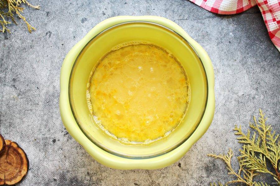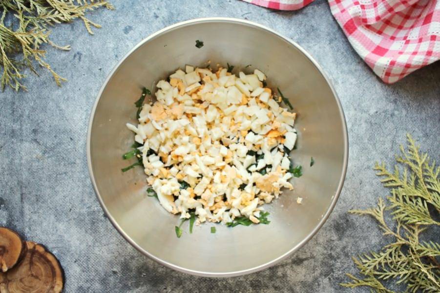 Яйца почистите и мелко порежьте, добавьте в миску с луком.