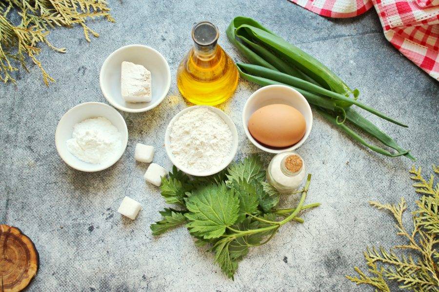 Подготовьте все необходимые ингредиенты для приготовления пирога с крапивой. Зеленый лук и крапиву сполосните и обсушите, у крапивы удалите стебли.