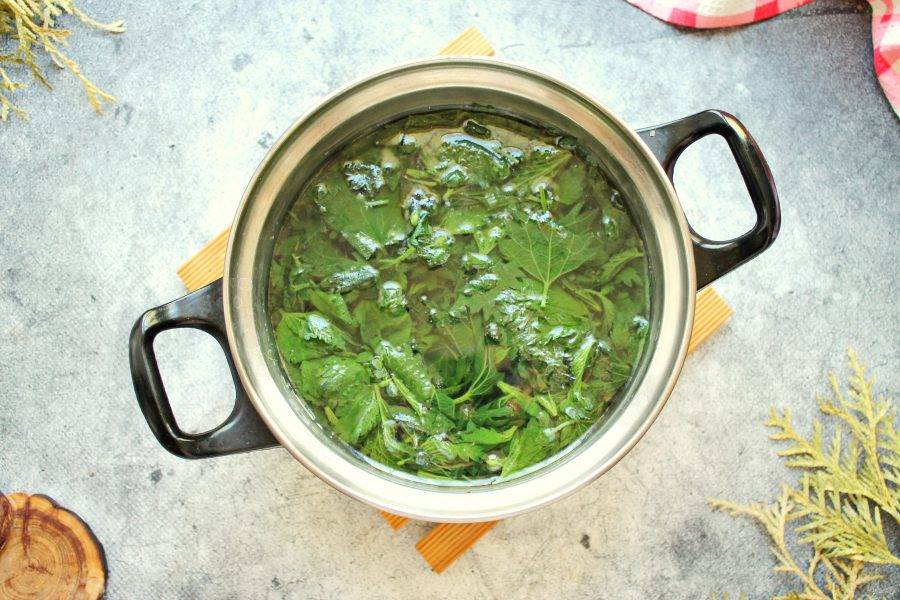 Листья крапивы сполосните, выложите в кастрюлю и залейте водой. Доведите все до кипения и варите в течение 3-5 минут. Откиньте крапиву на сито и дайте воде полностью стечь, остудите и отожмите.