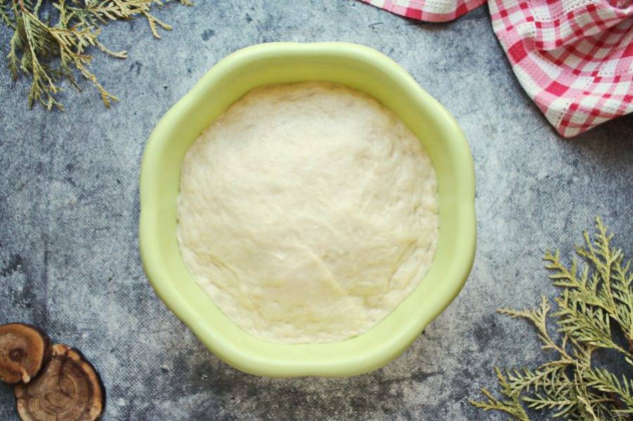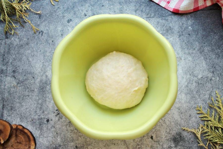 Сформируйте из теста шар, выложите его в миску, накройте и уберите в теплое место на 50-60 минут для подъема.
