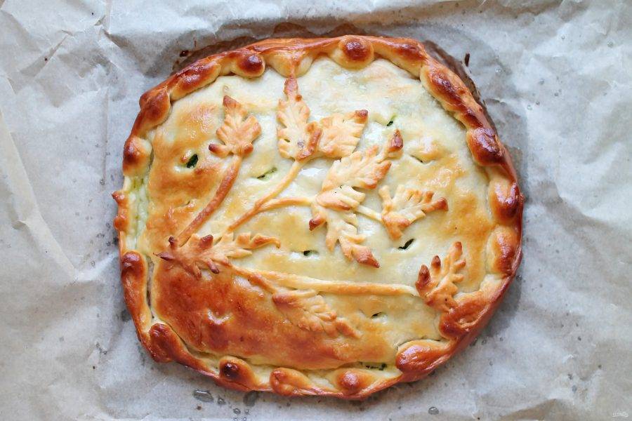 Раскатайте вторую часть теста и выложите на начинку. Подогните ее под начинку, а края нижнего поднимите и сделайте защипы. Украсьте верх и сделайте небольшие проколы, чтобы выходил пар при выпечке. Пирог накройте и уберите в теплое место на 15-20 минут на расстойку.