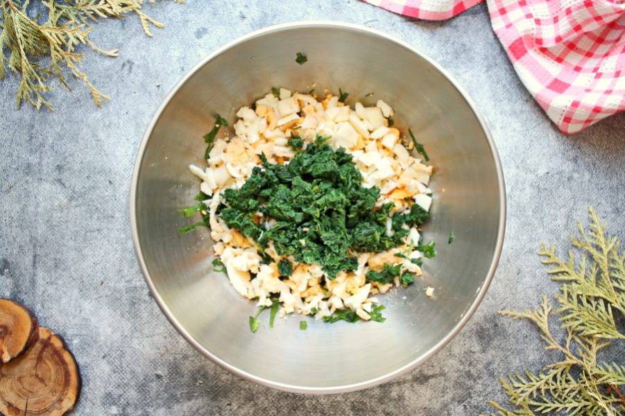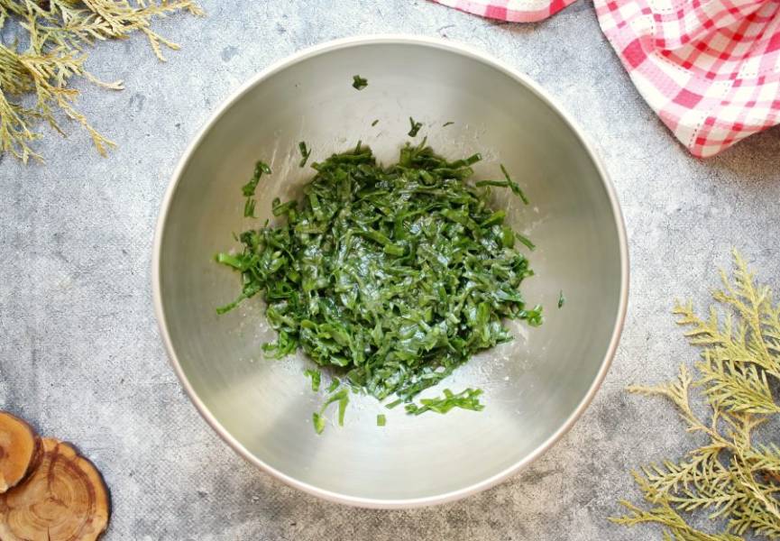 Крапиву мелко порежьте и добавьте в миску, перемешайте. Доведите начинку по вкусу на соль и уберите в сторонку.