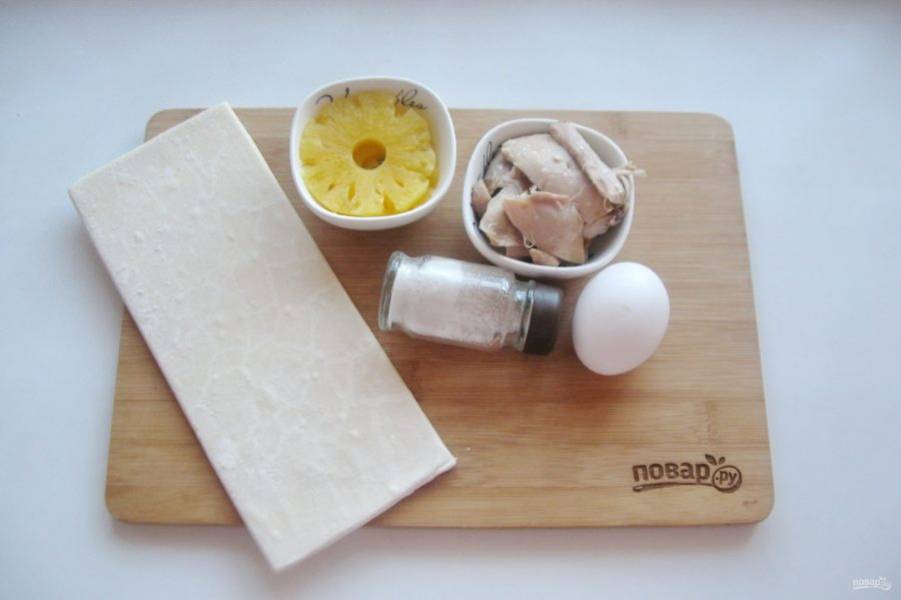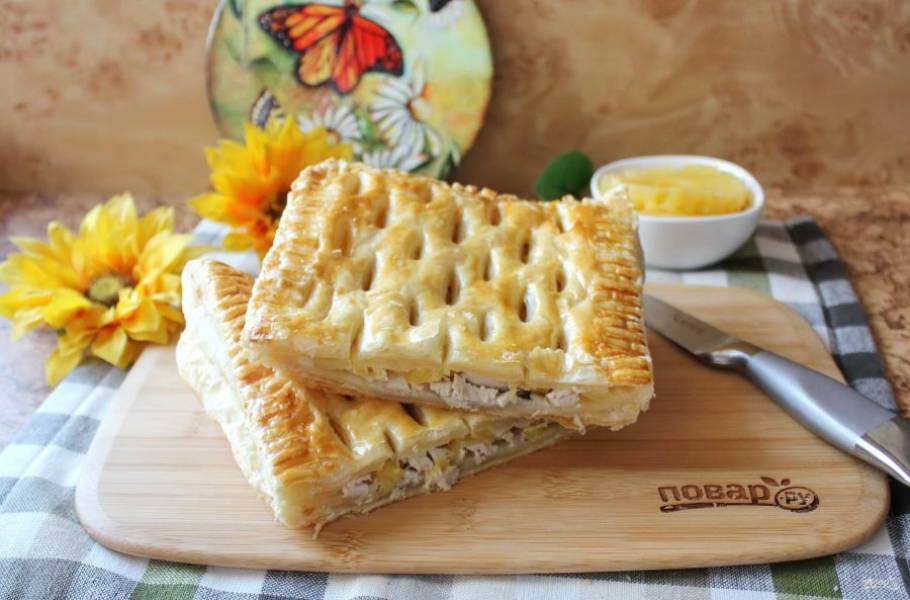 Курица с ананасами очень хорошо сочетаются. Этот "тандем" часто используют в салатах. Но давайте сегодня приготовим пирог из готового слоеного теста с отварной курицей и консервированными ананасами.