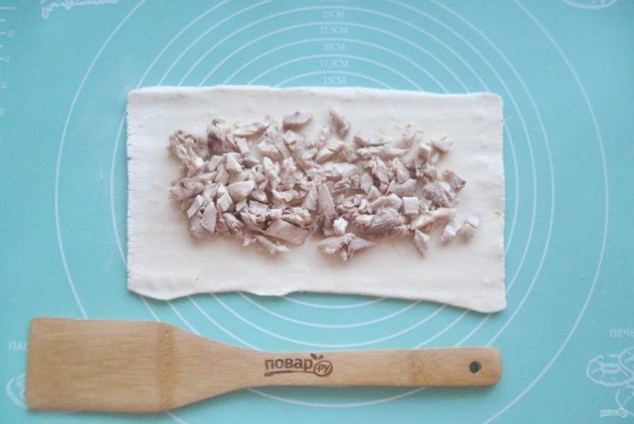 Отварную курицу мелко нарежьте и выложите на тесто. Если вы её не солили во время варки, то посолите сейчас.