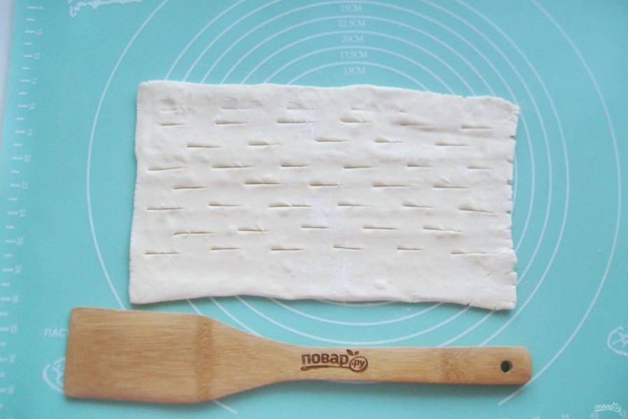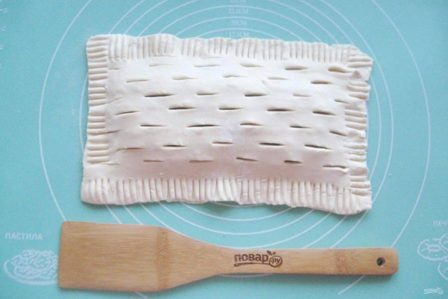 Второй пласт теста также раскатайте и сделайте надрезы в шахматном порядке.