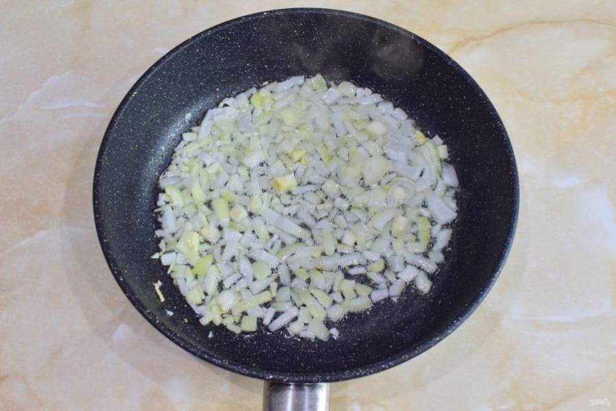 Приготовление начнем с начинки. Лук очистите, мелко нарежьте и обжарьте 1-2 минуты с добавлением растительного масла. Он станет мягче и прозрачнее.