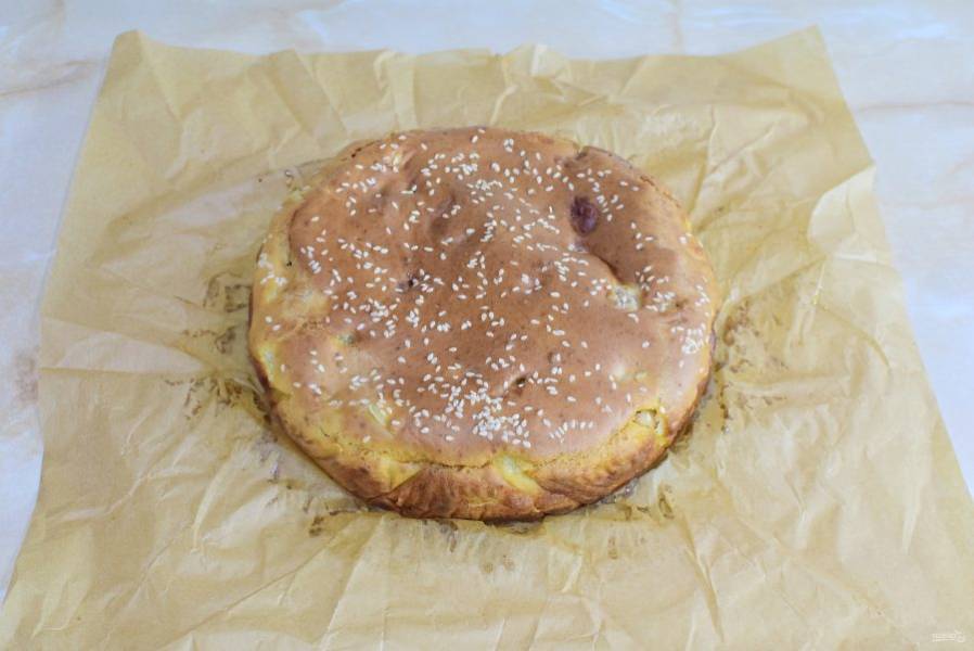 Готовый пирог немного увеличится в размере и станет аппетитного золотистого цвета. Извлеките его из духовки и немного остудите.