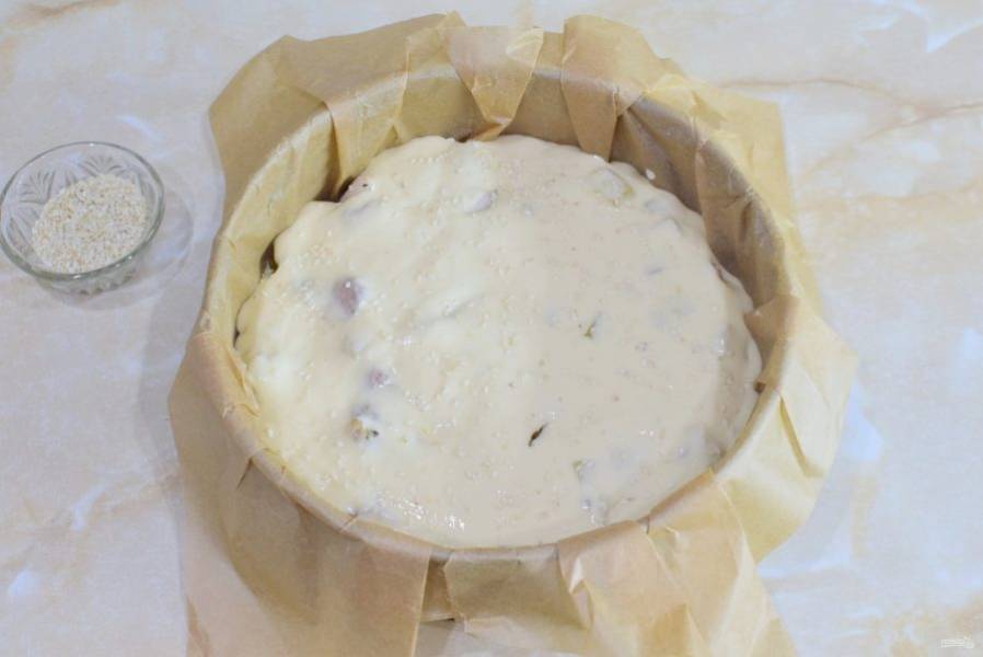 Залейте верх оставшимся тестом и посыпьте кунжутом. Поставьте пирог в духовку, предварительно разогретую до 180 градусов, примерно на 40-50 минут. Ориентируйтесь по своей духовке.