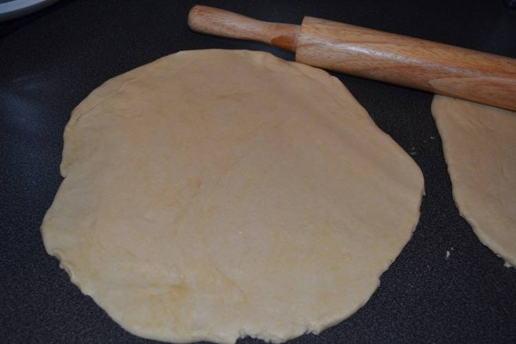 6. Готовое тесто нужно поделить на две части, одна из которых должна быть немного больше второй. Раскатать на присыпанной мукой поверхности.