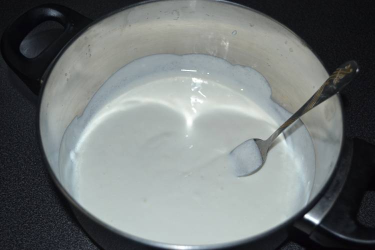 2. Пока топится масло, погасить соду в кефире. Добавить щепотку соли и сметану. Все как следует перемешать.