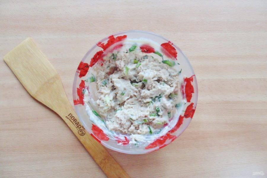 Отварную курицу измельчите любым способом. Добавьте нарезанную петрушку.