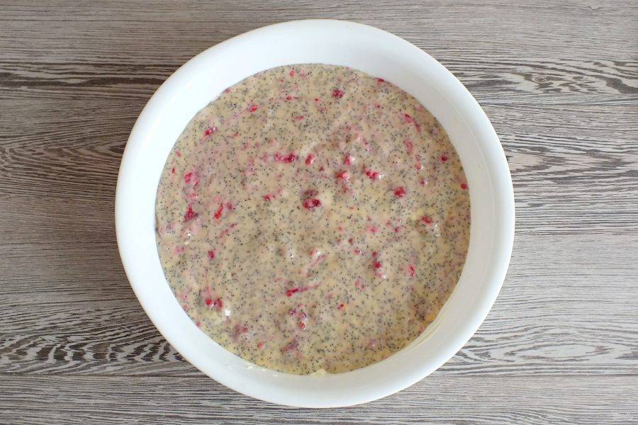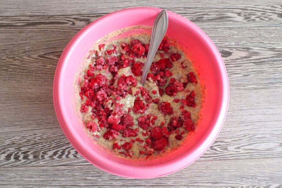 Добавьте малину. Аккуратно вмешайте её в тесто.