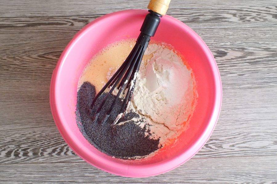Всыпьте муку, разрыхлитель для теста, сухой мак. Перемешайте.
