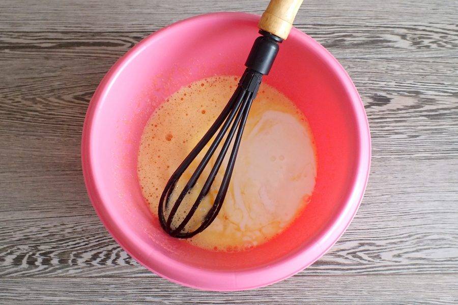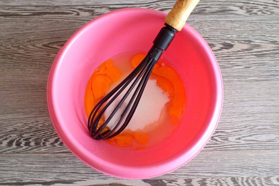 Смешайте в чаше яйца с сахаром. Взбивать не нужно, достаточно просто перемешать венчиком.