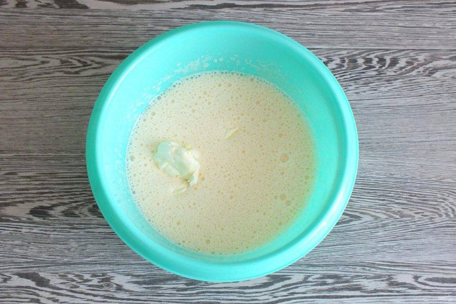 В яичную массу добавьте мягкое масло. Взбейте еще раз.