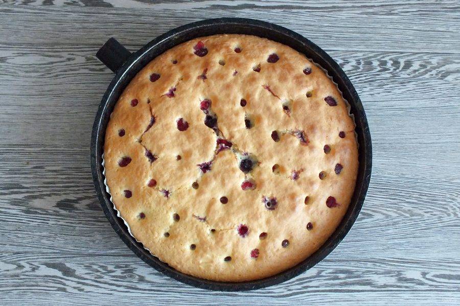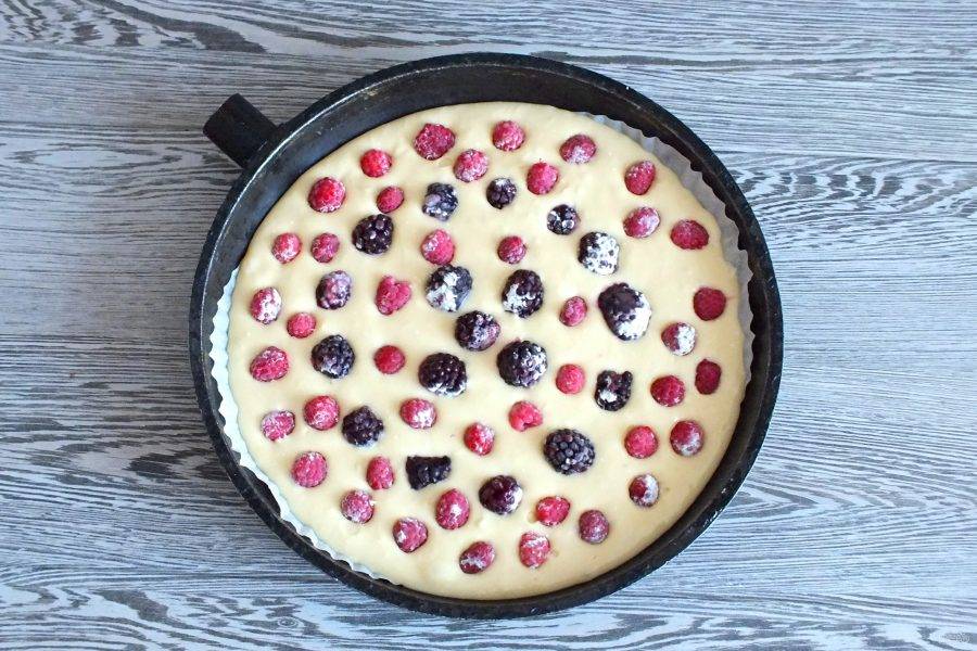 Форму для выпечки застелите бумагой для выпечки. Вылейте тесто. Распределите ягоды, вдавливая их в тесто. Поставьте выпекаться будущий пирог в разогретую до 180 градусов духовку на 30 минут. Учитывайте особенности своей духовки!