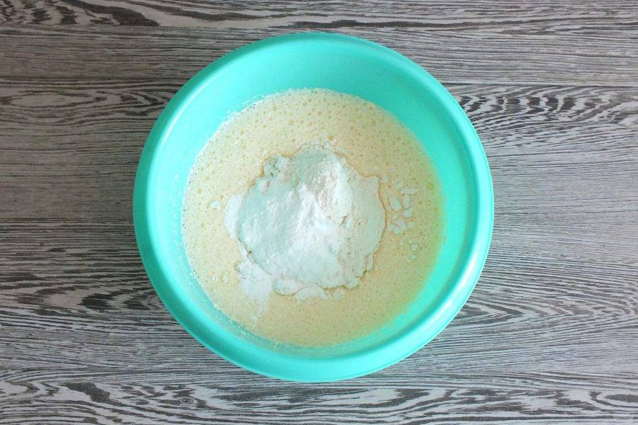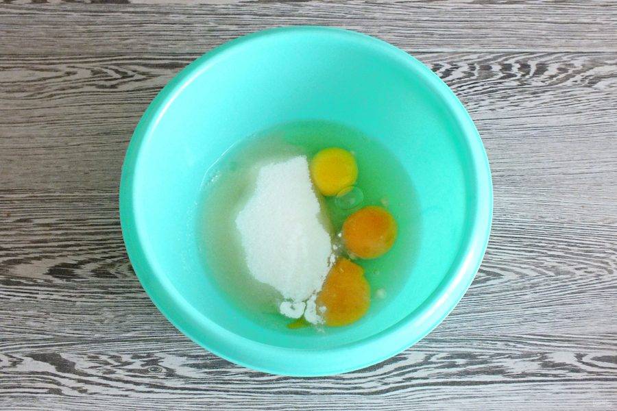 Соедините в чаше яйца и сахар. Взбейте в пышную пену.