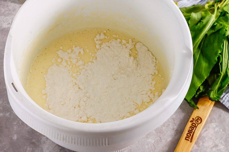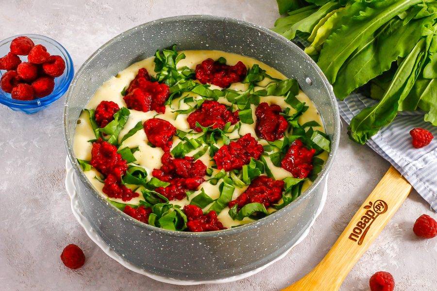 Смажьте форму растительным маслом и выложите в нее приготовленное тесто. Промойте листья щавеля, промокните бумажными салфетками и нарежьте лентами, срезая стебли. Выложите сверху на тесто.