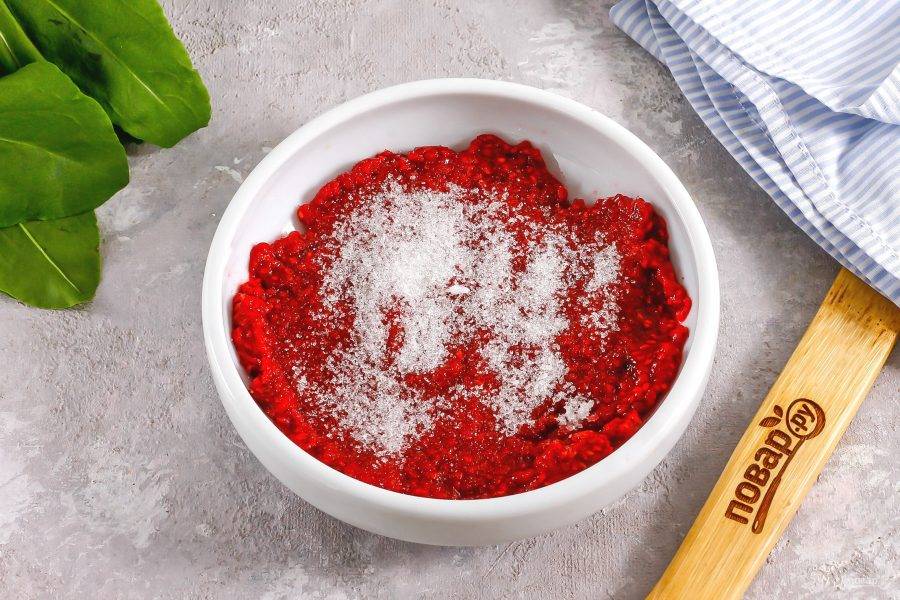 В это время вилкой разотрите промытые ягоды малины с сахаром.