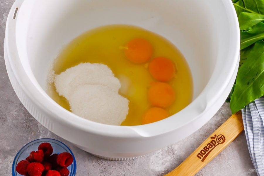 Куриные яйца вбейте в чашу кухонного комбайна или емкость для миксера, всыпьте туда же сахарный песок и соль. Взбейте на высокой скорости примерно 4-5 минут в пышную пену.