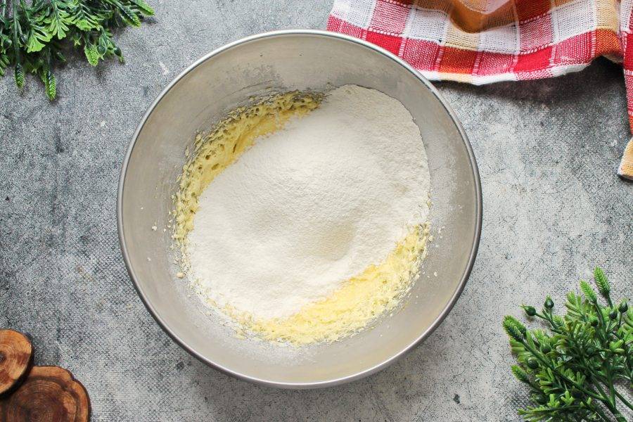 Муку смешайте с разрыхлителем и просейте в миску. Замесите мягкое, без комочков тесто.