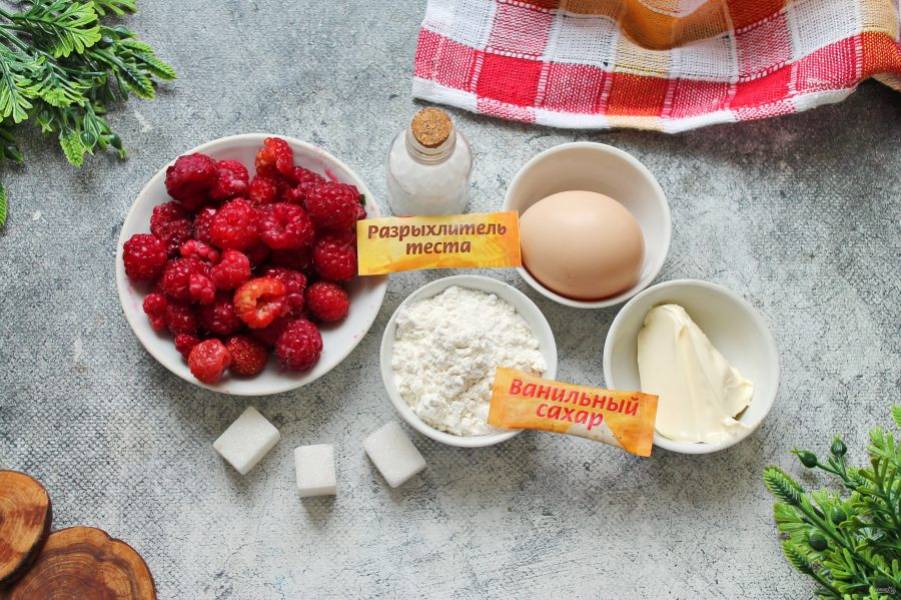 Подготовьте все необходимые ингредиенты для приготовления пирога с малиной простой. Ягоды переберите, удаляя веточки и хвостики, желательно ее не мыть или обсушить перед добавлением в пирог. Сливочное масло достаньте заранее, чтобы стало мягким. Включите духовку разогреваться до температуры 180 градусов.