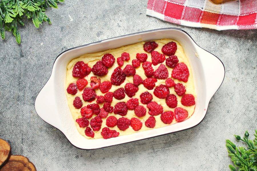 Поверх теста разложите ягоды ровным слоем и немного утопите их.