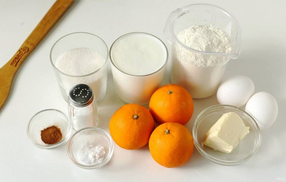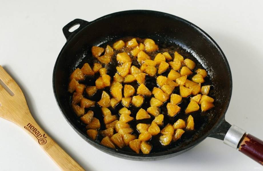 В разогретую сковороду выложите 1 ст.л. масла и когда оно растопится, добавьте мандариновые дольки, разрезанные на 2-3 части. Через 3-4 минуты добавьте корицу и 2 ст.л. сахара. Еще пару минут и начинка готова. Снимите ее с огня и дайте остыть.