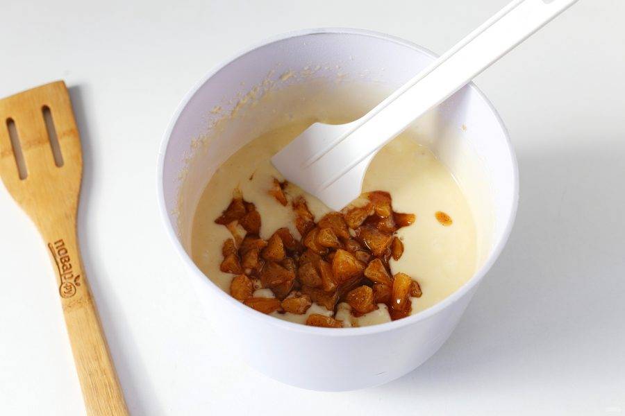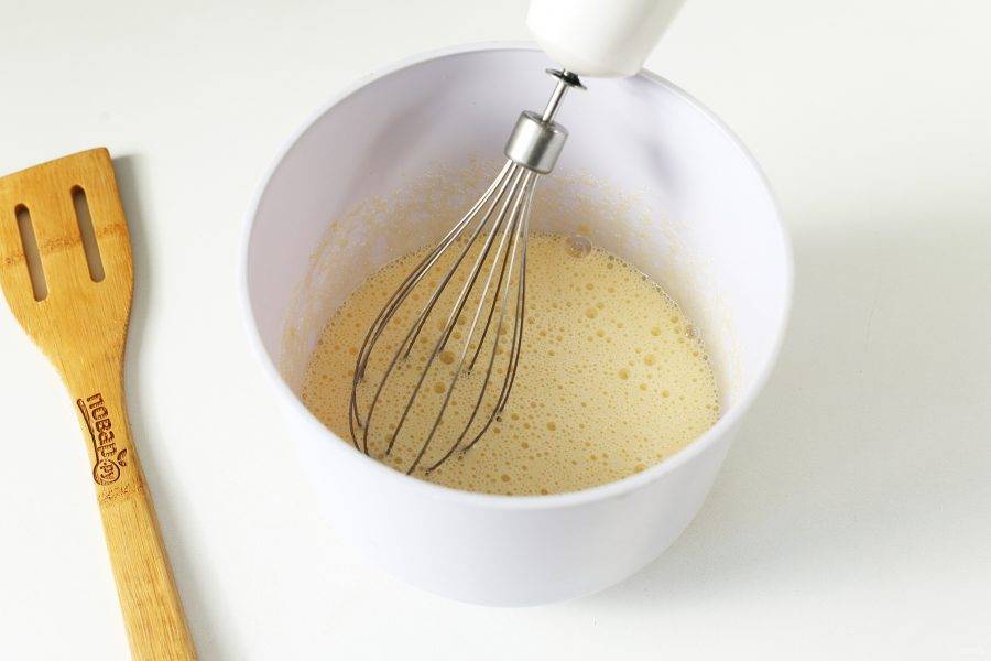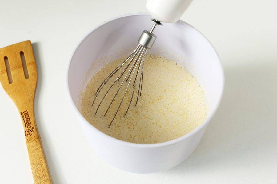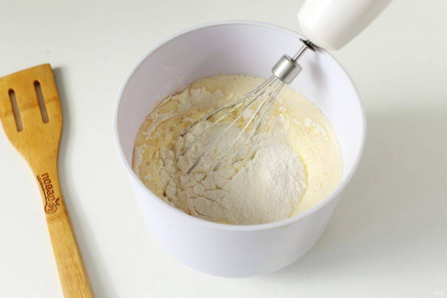 Добавьте кефир, растопленное и чуть охлажденное сливочное масло, соду и перемешайте до появления пузырьков.