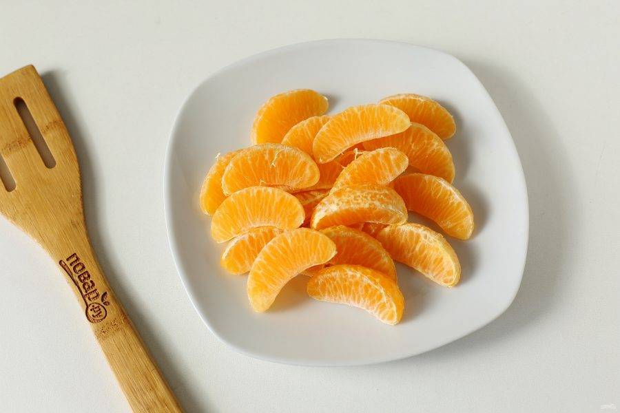 Мандарины очистите от кожуры и разделите на дольки. Один мандарин оставьте для верха.