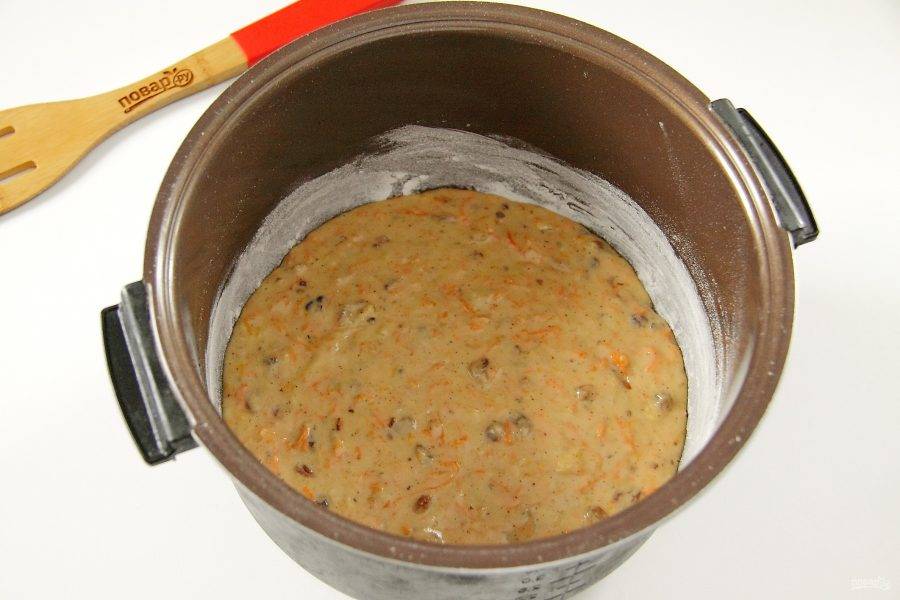 Чашу мультиварки смажьте маслом, обсыпьте дно и бока мукой. Вылейте тесто и разровняйте его ложкой. Выпекайте в режиме "Выпечка" до звукового сигнала, оставьте на 10 минут на подогреве, после чего откройте крышку и остудите пирог.