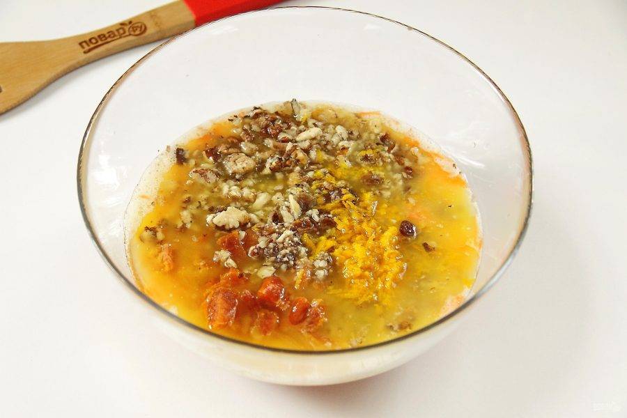 Добавьте сюда же измельченные орехи, промытый и обсушенный изюм, нарезанную курагу, цедру и сок одного апельсина.