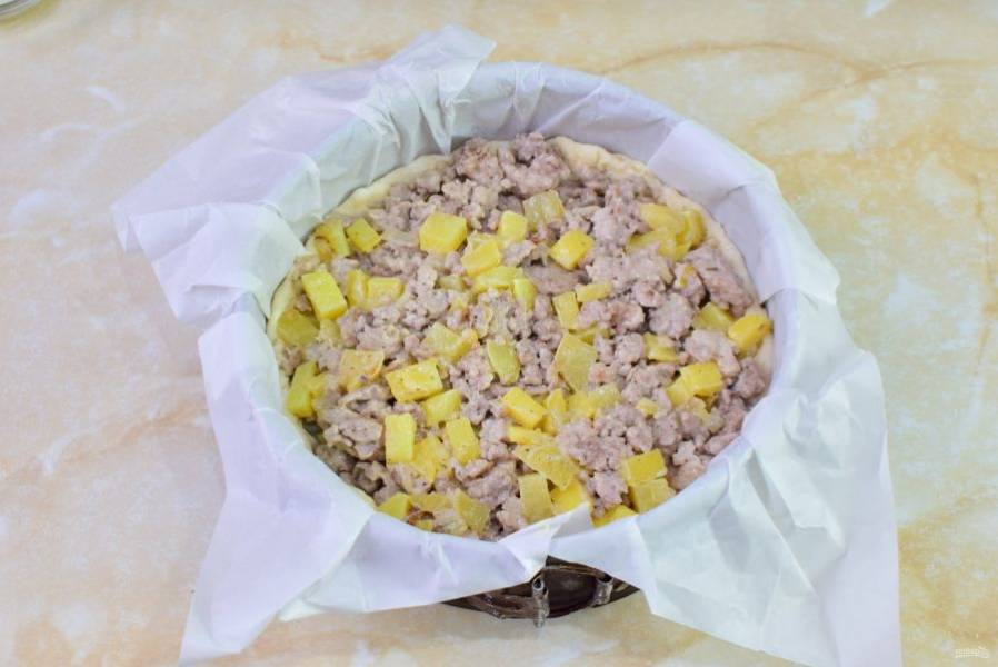 Тесто разделите на 2 неравные части. Большую часть распределите по дну формы, формируя бортики.