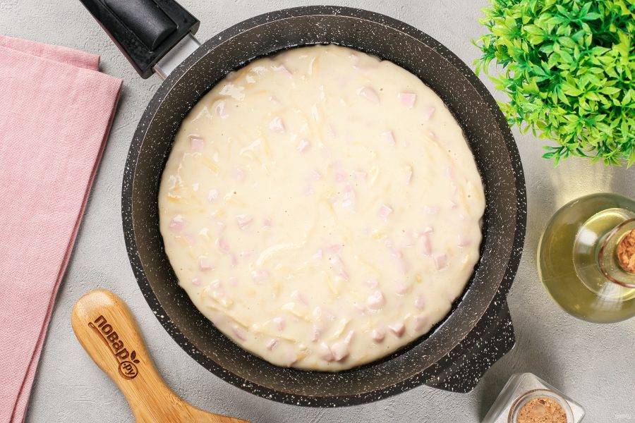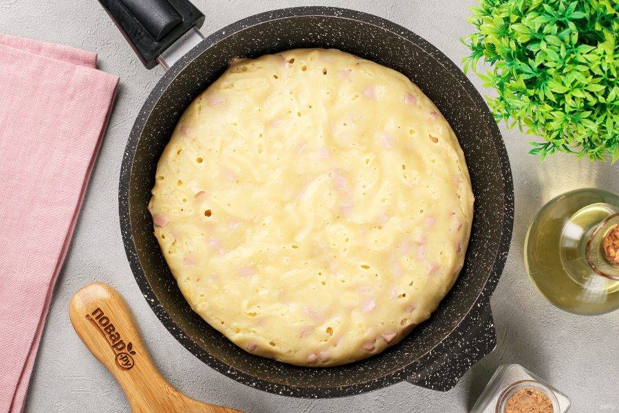 Разогрейте сковороду и смажьте маслом. Вылейте тесто, убавьте огонь до минимума, накройте крышкой и готовьте около 20 минут.