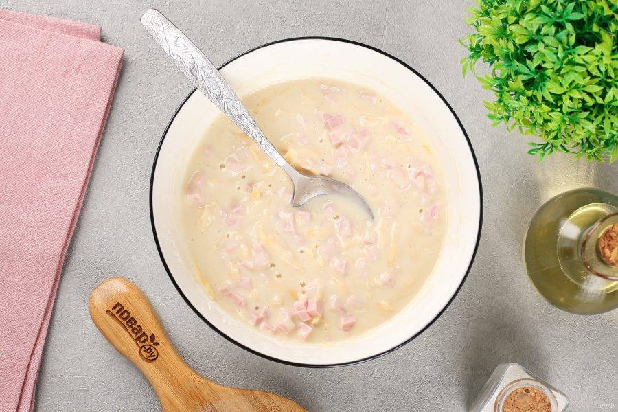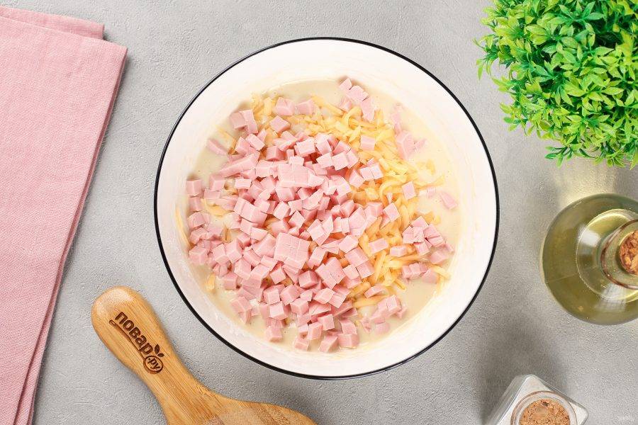 Добавьте нарезанную кубиками колбасу и тёртый сыр.