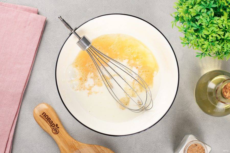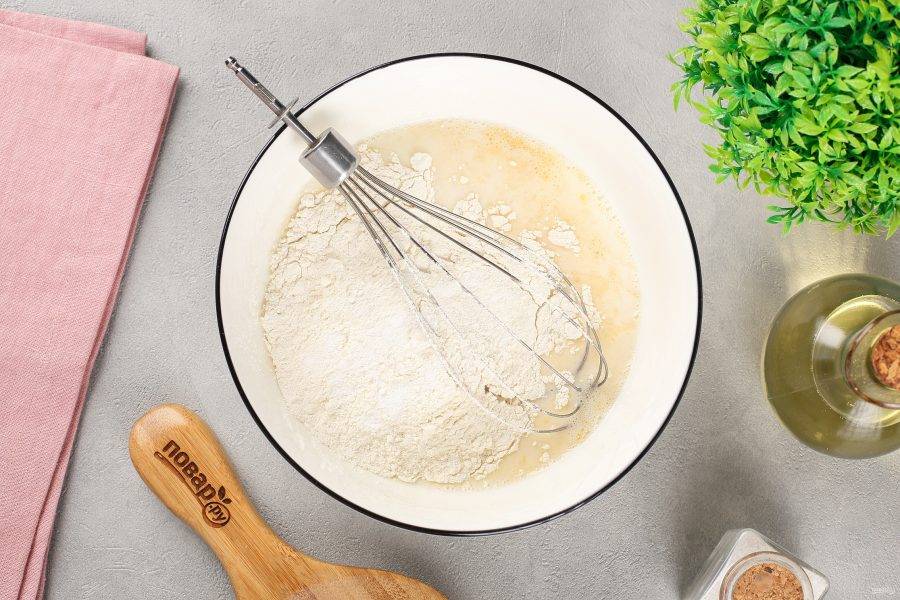 Затем добавьте муку и разрыхлитель. Перемешайте всё ещё раз.