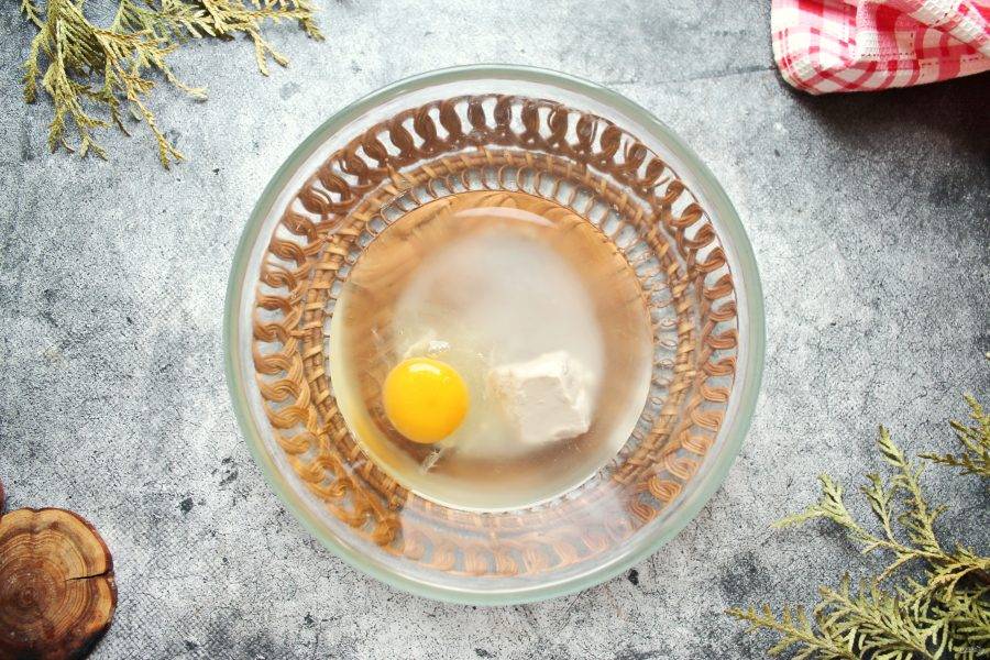 В миску налейте теплую воду, всыпьте сахар, соль, разбейте яйцо и добавьте свежие дрожжи. Все хорошо перемешайте до однородной массы.