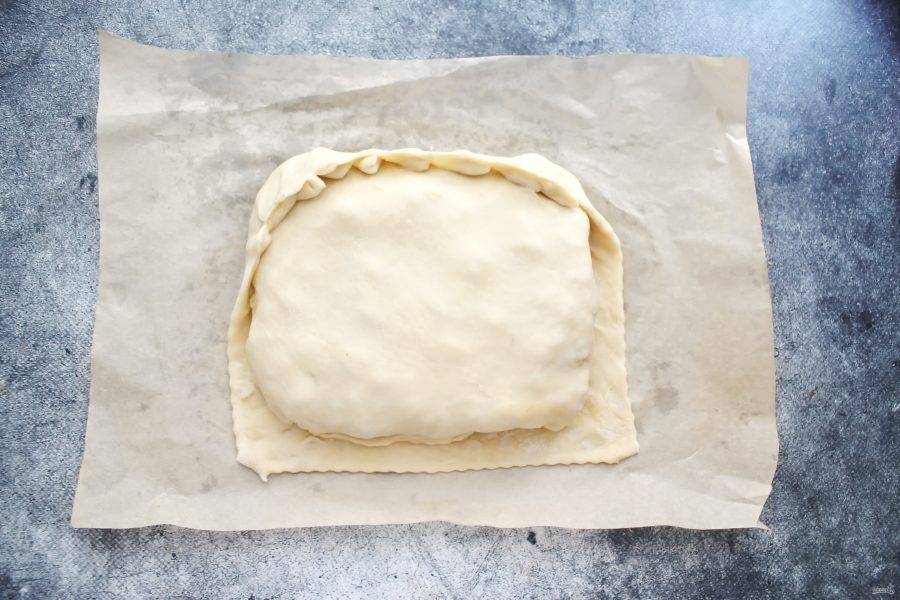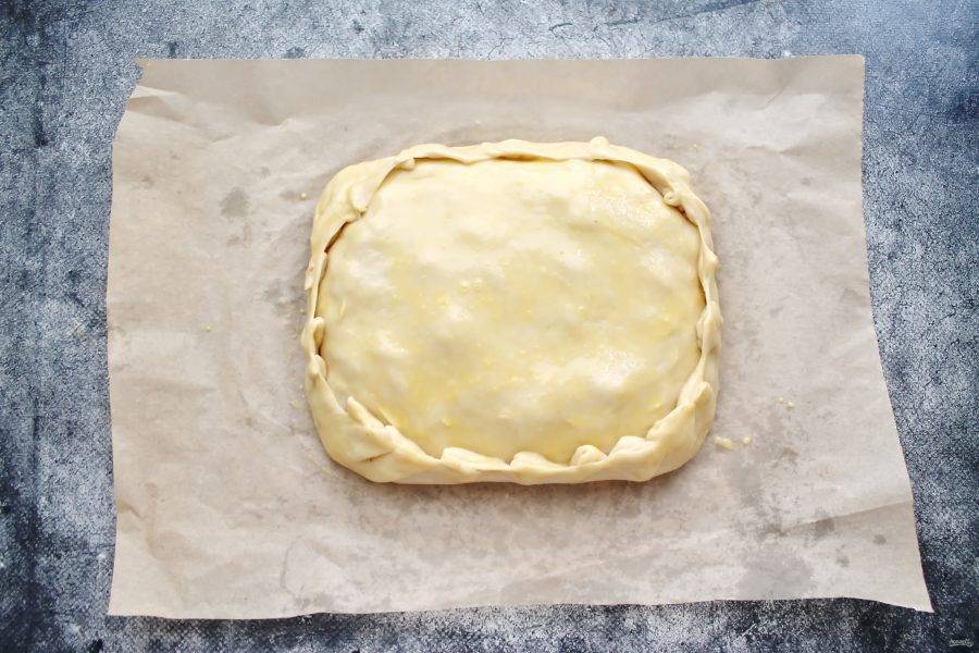 Раскатайте вторую часть теста и выложите ее поверх начинки. Подверните края теста внутрь начинки. Лишнее тесто нижней части обрежьте, оно пойдет на украшения. Поднимите нижние края и защипайте по всему краю.