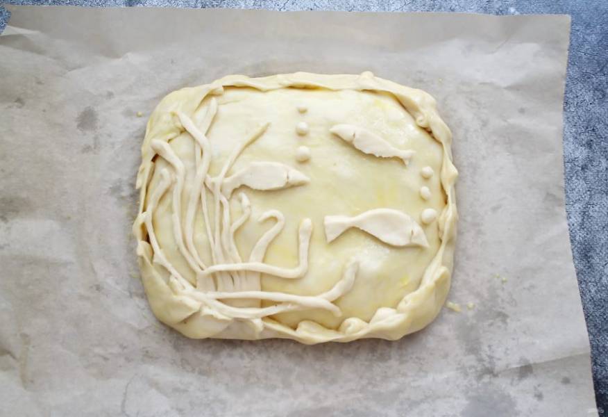 Из обрезков теста сделайте украшения и разложите сверху. Пирог вместе с пергаментом переложите на противень, накройте и уберите в теплое место на 20 минут для подъема.