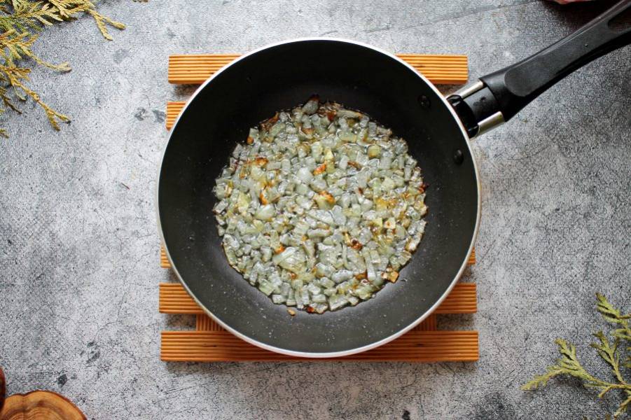 Репчатый лук почистите и мелко порежьте. В сковороду налейте растительное масло, разогрейте на среднем огне и выложите лук. Обжаривайте его в течение 5-7 минут до мягкости и снимите с огня.
