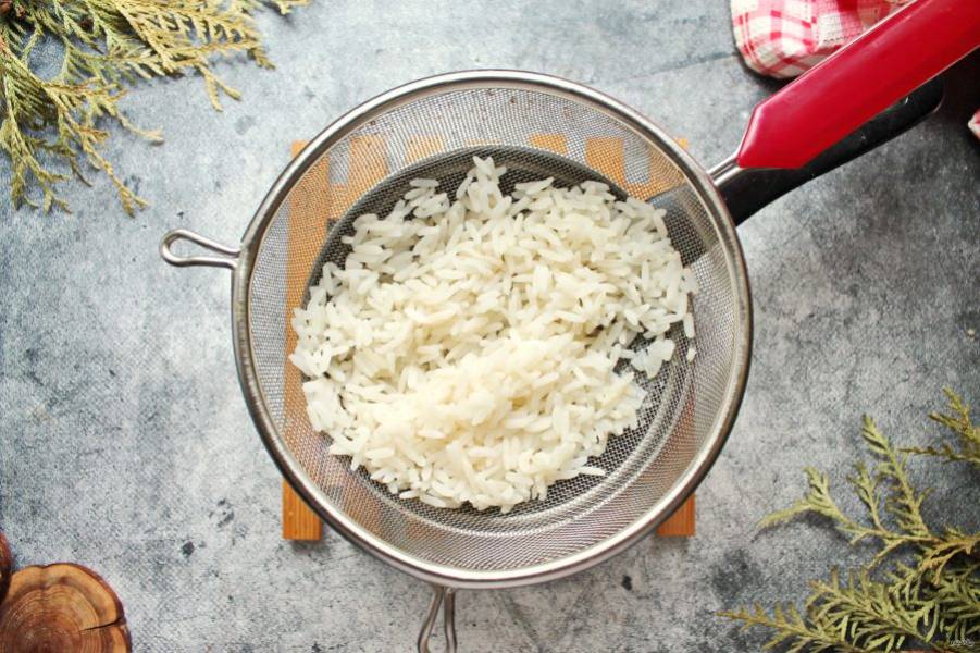 Пока тесто подходит — подготовьте начинку. Для этого отварите рис в соленой воде до готовности, откиньте на сито, промойте и дайте воде полностью стечь.