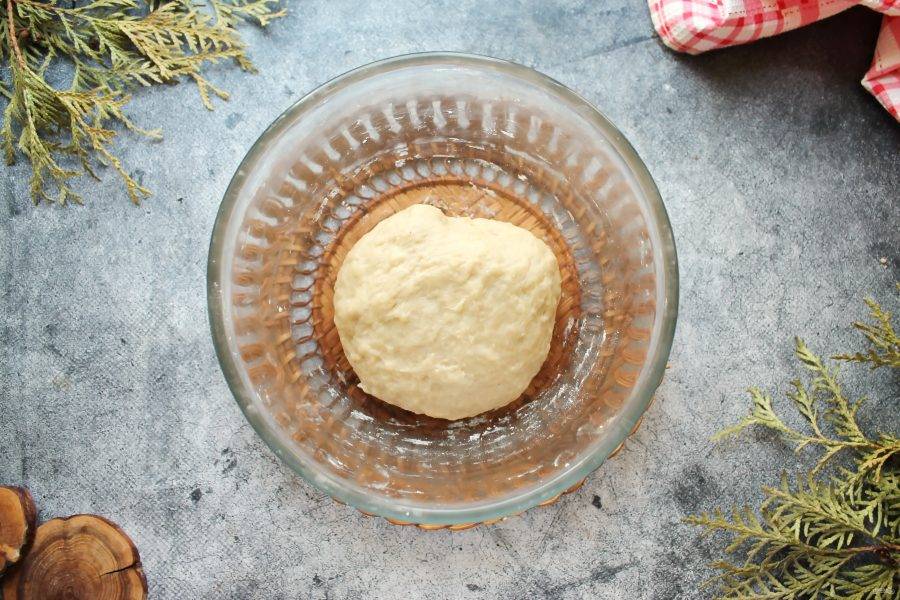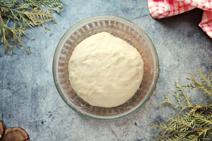 Постепенно всыпая муку, замесите мягкое, не липкое тесто. Сформируйте из теста шар, положите его обратно в миску и накройте. Уберите тесто в теплое место на 50-60 минут для подъема.