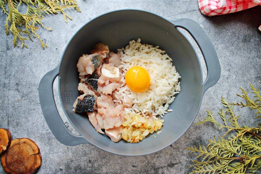 В миску выложите подготовленную рыбу, отварной рис и обжаренный репчатый лук. Все посолите, поперчите и добавьте желток, перемешайте все до равномерного распределения.