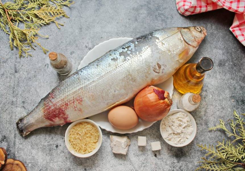 Подготовьте все необходимые ингредиенты для приготовления пирога с омулем.