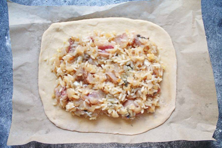 Разделите тесто на две части, одна из которых 2/3, а другая 1/3 теста. Большую часть раскатайте в прямоугольник на пергаменте, выложите всю начинку и разровняйте.