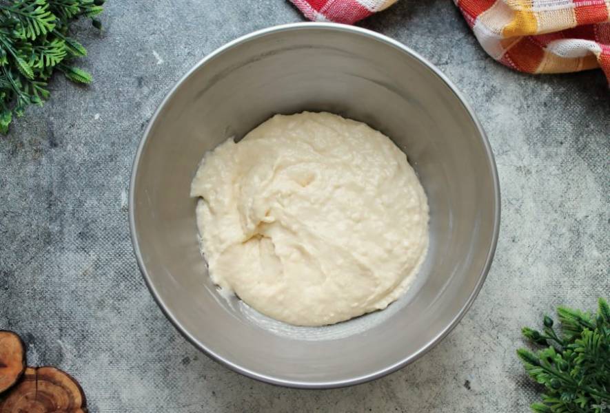 Муку соедините с разрыхлителем, перемешайте венчиком и просейте в миску. Перемешайте до однородного теста. Тесто должно получиться по консистенции как сметана средней густоты.