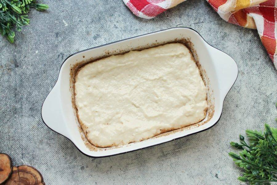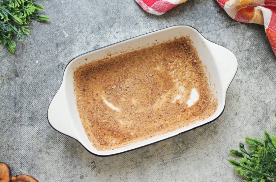 Форму для запекания смажьте растительным маслом и посыпьте панировочными сухарями или манкой. Это позволит после приготовления легко извлечь готовый пирог из формы.