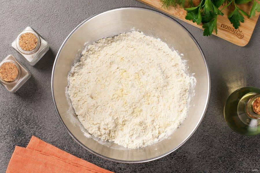 Соедините муку и размягчённое сливочное масло. Перетрите руками до состояния крошек.