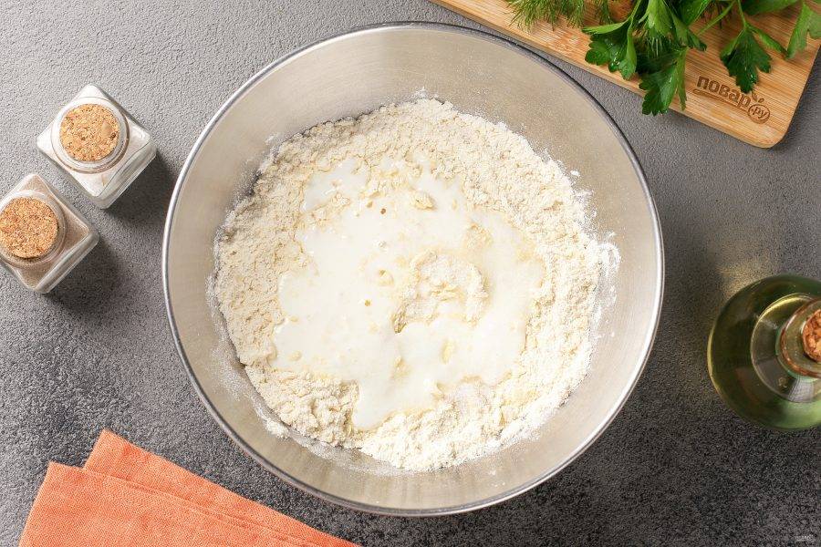 Ту часть, что побольше, раскатайте на присыпанной мукой поверхности и перенесите в жаропрочную форму, смазанную маслом. Сформируйте руками небольшие бортики и сверху выложите начинку.